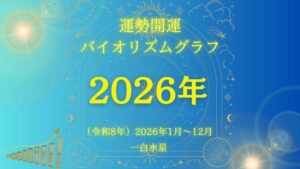 「2026年、2027年、2028年、2029年、2030年、2031年、2032年、2033年、2034年、2035年、2036年、2037年」毎年の運勢開運バイオリズムグラフ(年運)です。九星は一年ごとに規則正しく巡航しているため12年先の未来を予測することが可能です。バイオリズムグラフを参考に計画的な人生設計を立てましょう!