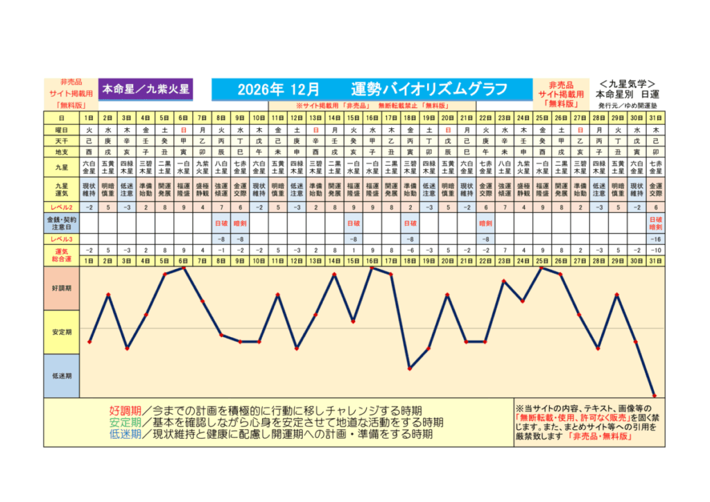 2026年12月 <喜悦運、収穫期…凶運> ●暗剣殺付き
