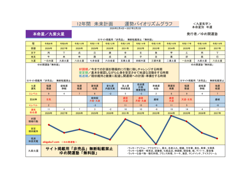 九紫火星/運勢未来グラフ(12年間/2026年~2037年)